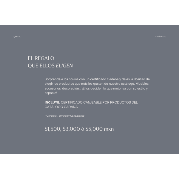 Sorprende a los novios con un certificado Cadana y dales la libertad de elegir los productos que más les gusten de nuestro catálogo. Muebles, accesorios, decoración… ¡Ellos deciden lo que mejor va con su estilo y espacio!